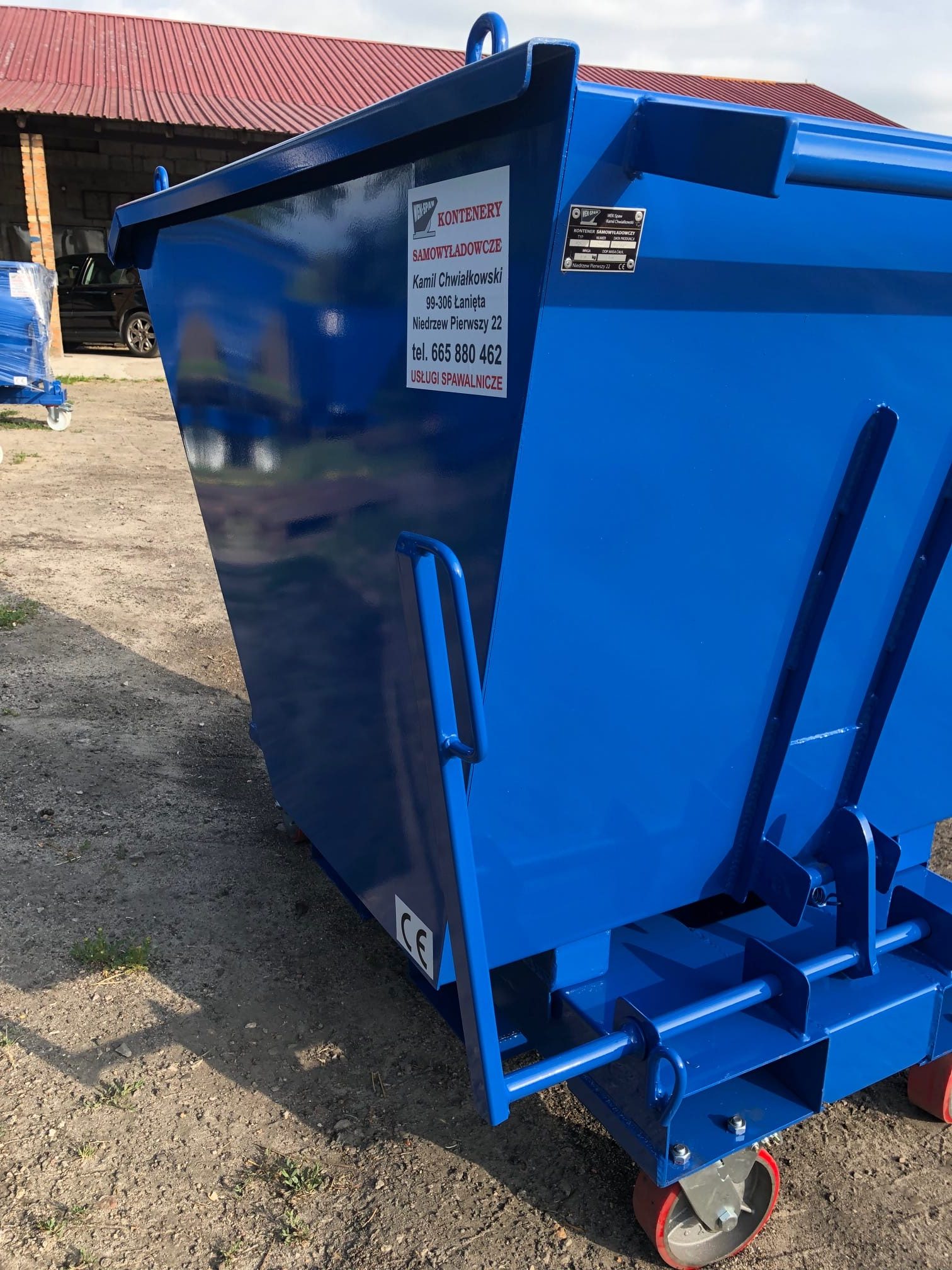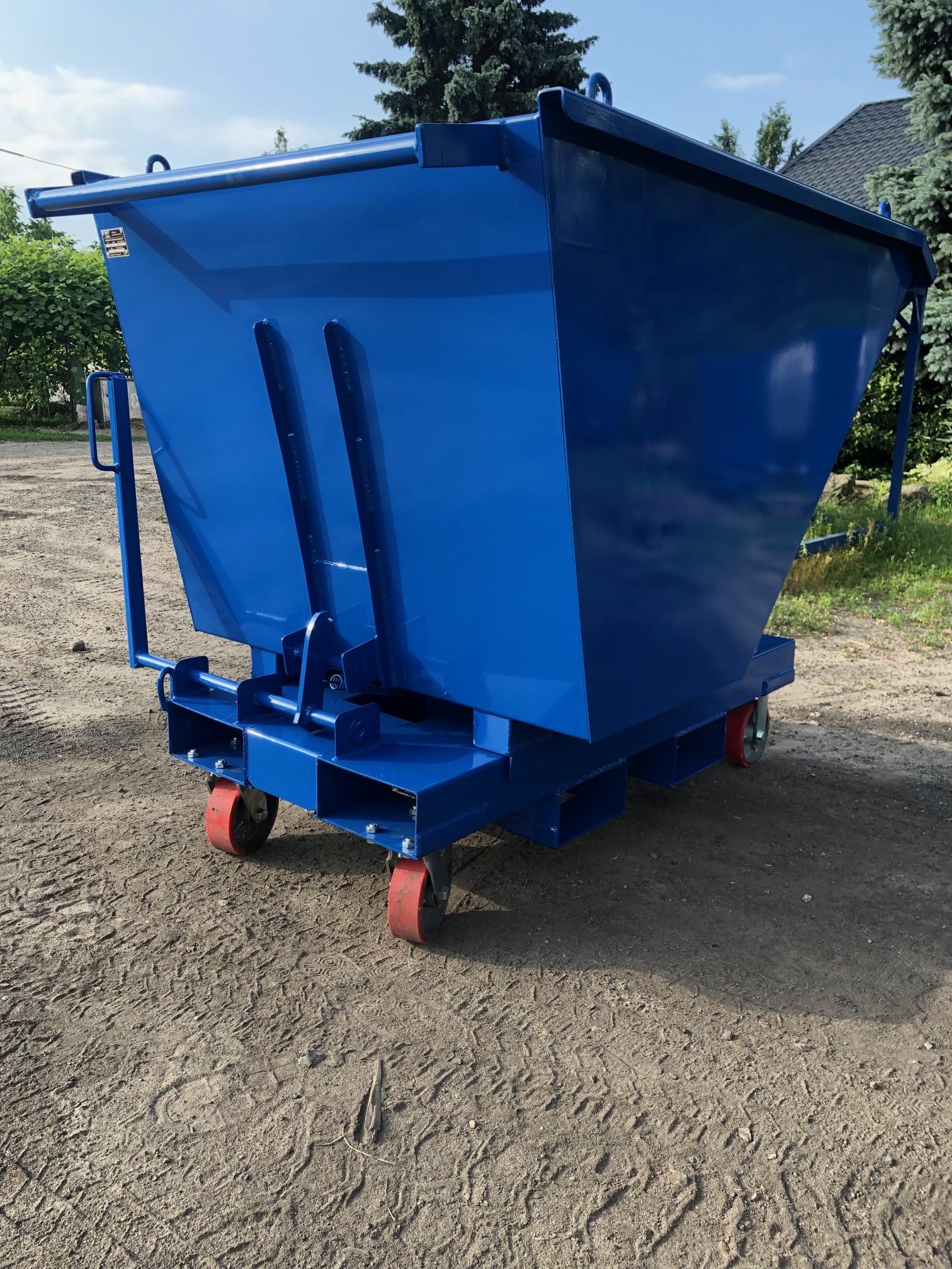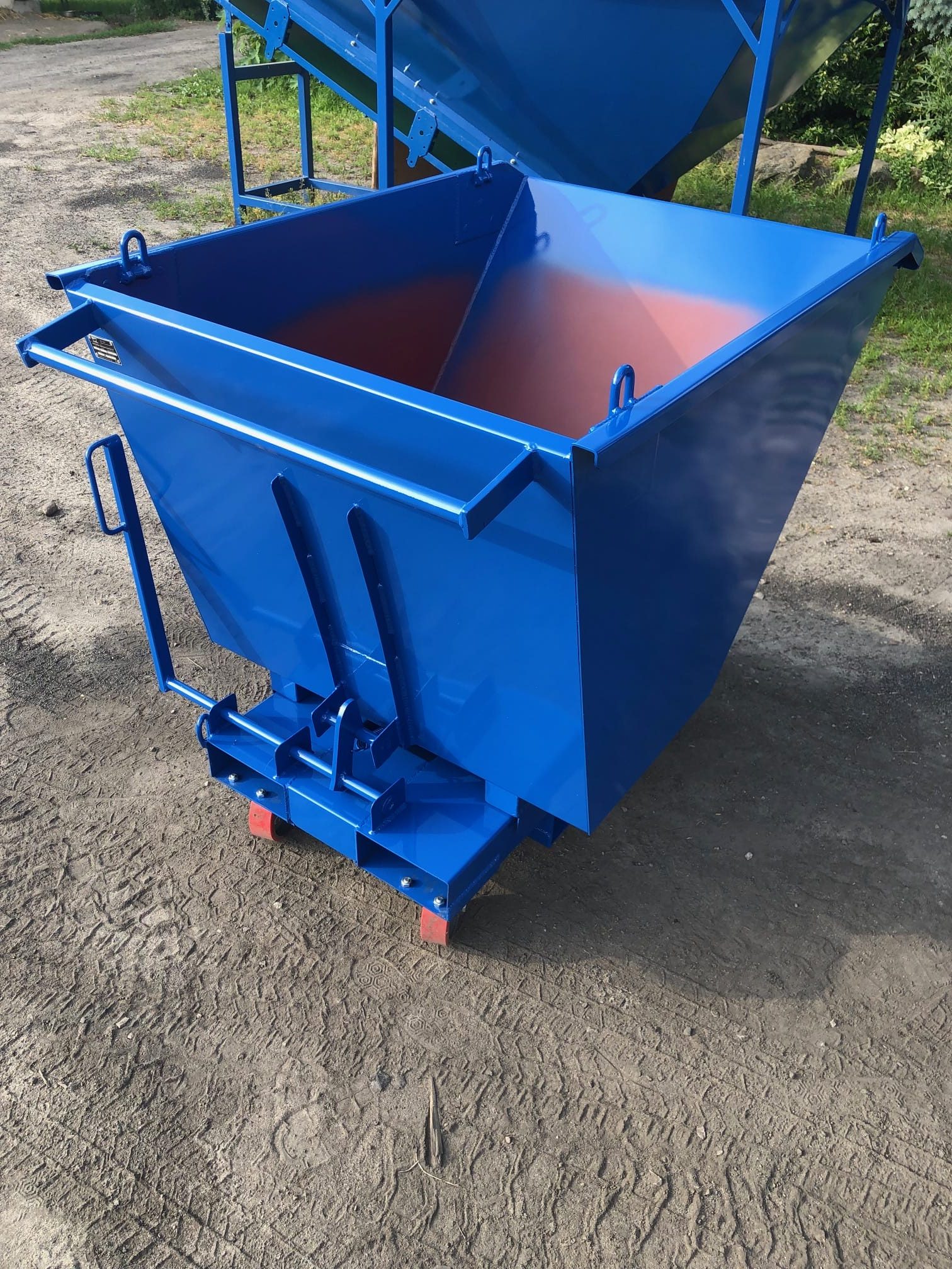Kontener samowyładowczy o pojemności 0,5 m3 wyposażony w zestaw kołowy żeliwno-poliuretanowy fi 150, uchwyt ułatwiający przepychanie, dodatkowy (boczny) wjazd na widły oraz w 4 uchwyty umożliwiające transport pionowy kontenera.