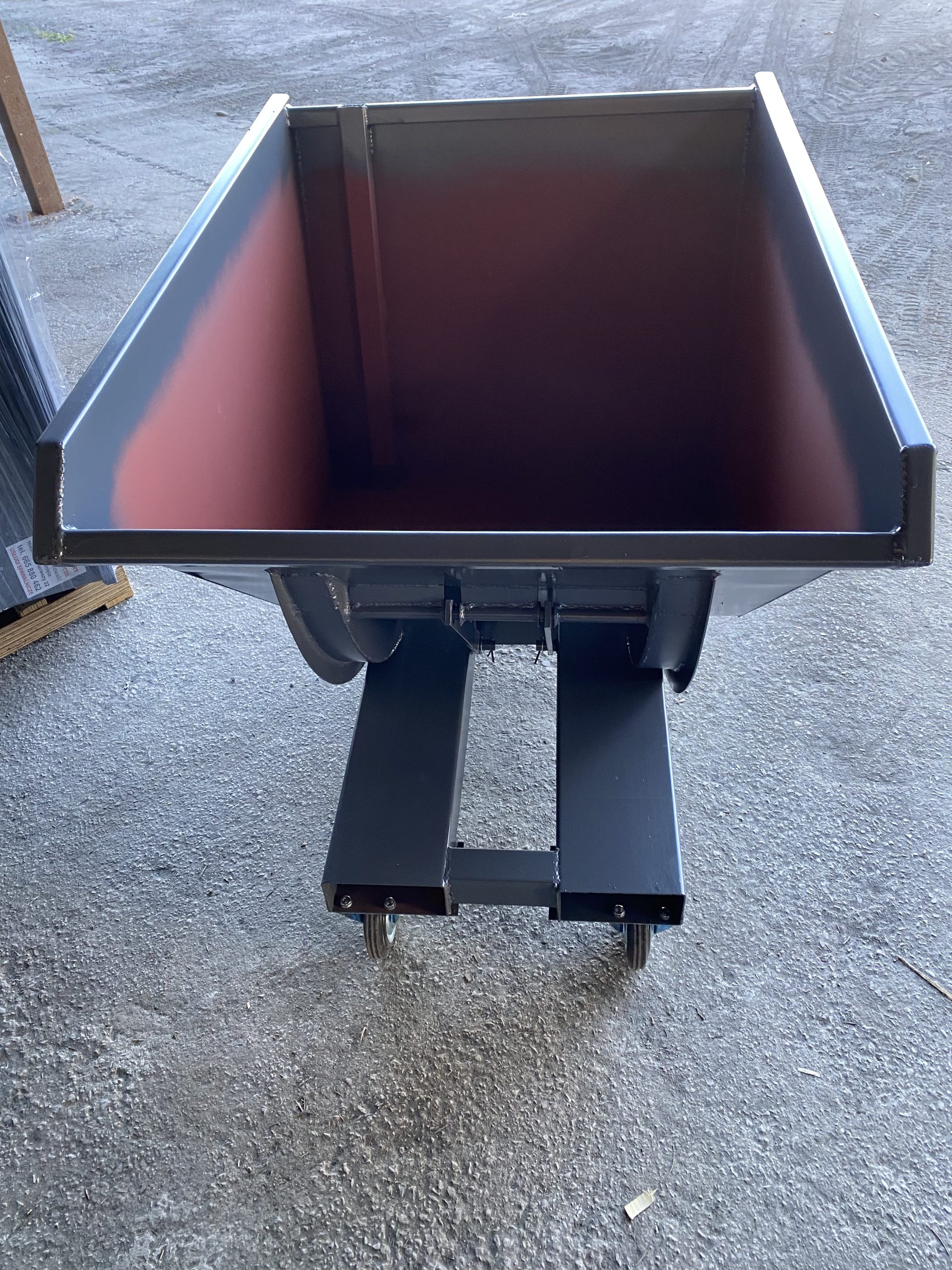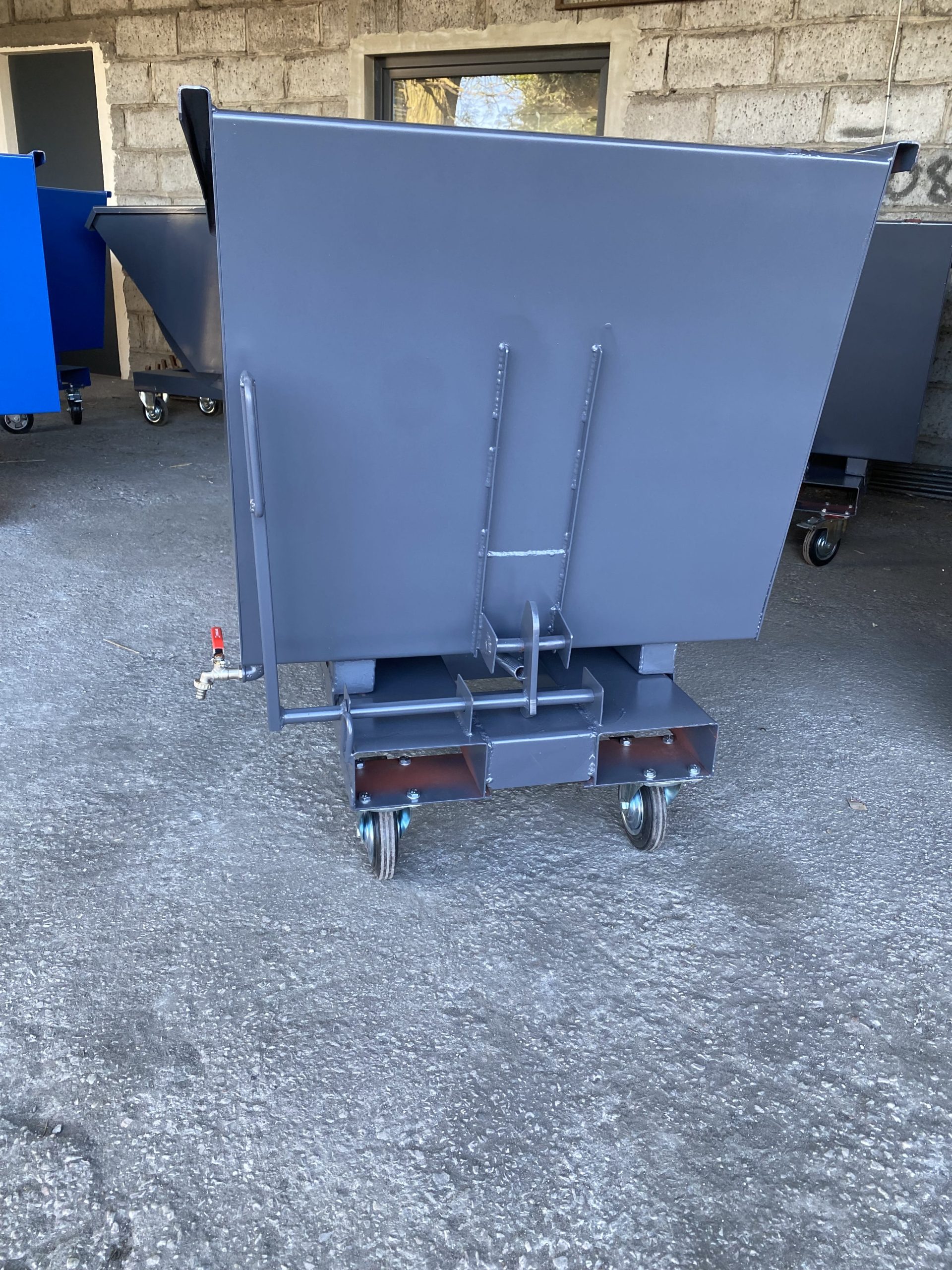 Kontener samowyładowczy o pojemności 0,5 m3 wyposażony w zestaw kołowy gumowo-metalowy fi 160, kran spustowy oraz system odciągania chłodziwa za pomocą przeznaczonego do tego urządzenia.