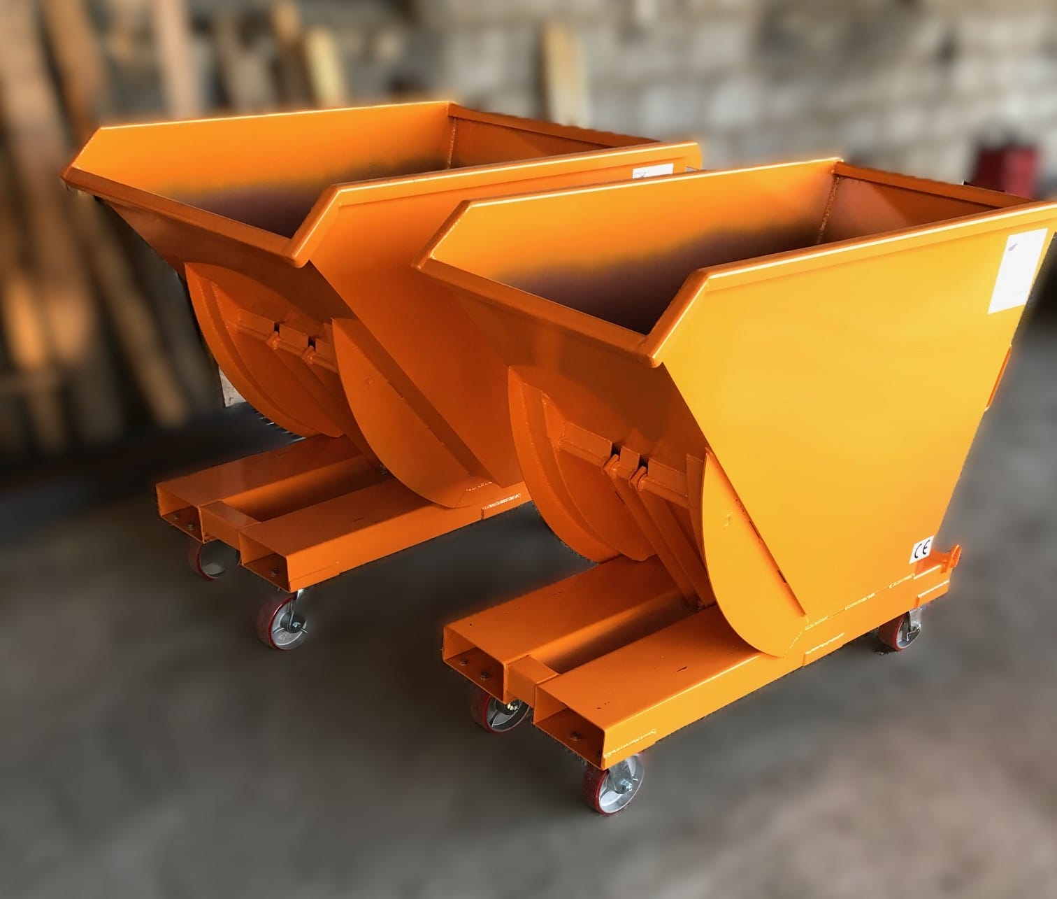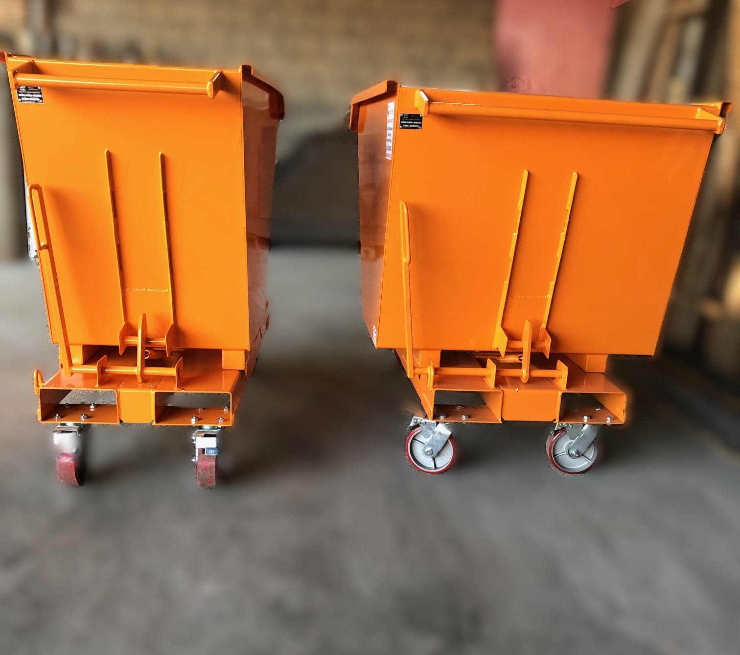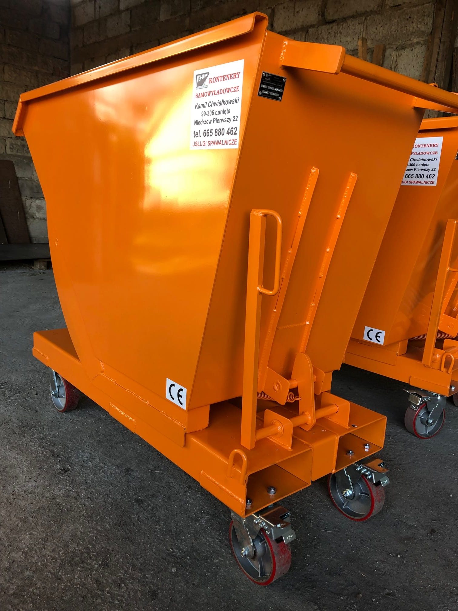 Kontener samowyładowczy o pojemności 0,5 m3 wyposażony w zestaw kołowy żeliwno-poliuretanowy fi 150 oraz w uchwyt ułatwiający przepychanie.